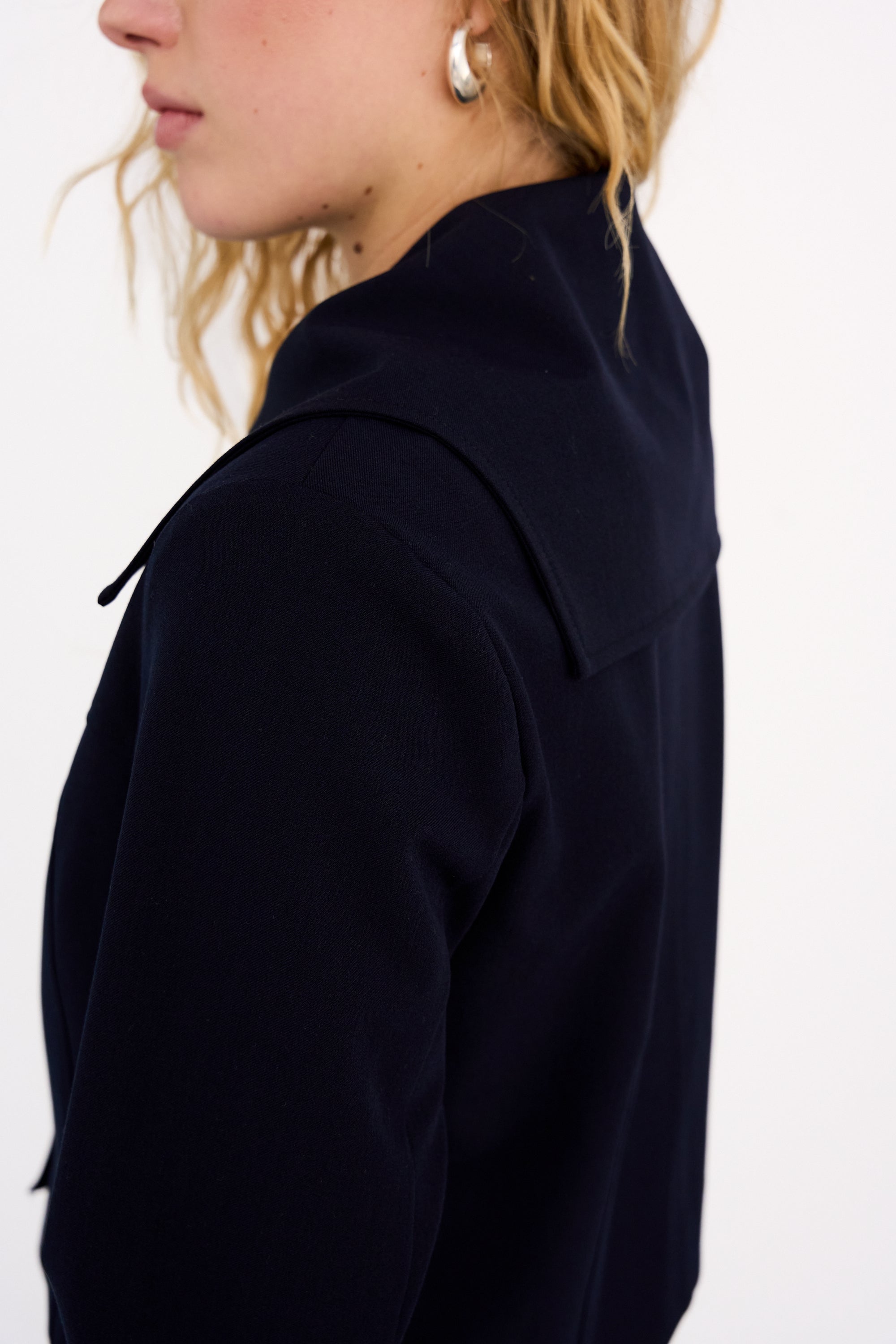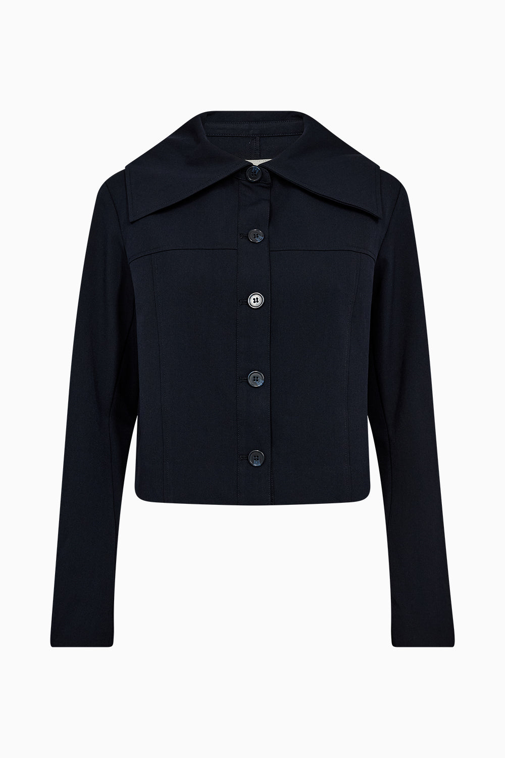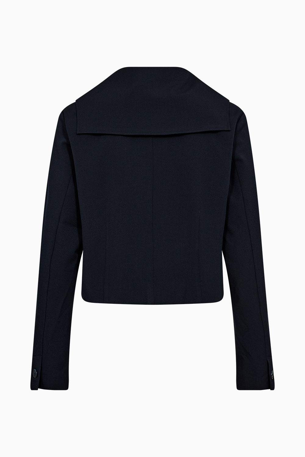 The Andrea Sailor Jacket is a clean-cut statement with subtle nautical nods. Crafted in a structured dark navy fabric, it features a sharp sailor collar and cropped silhouette for a modern, minimal finish.