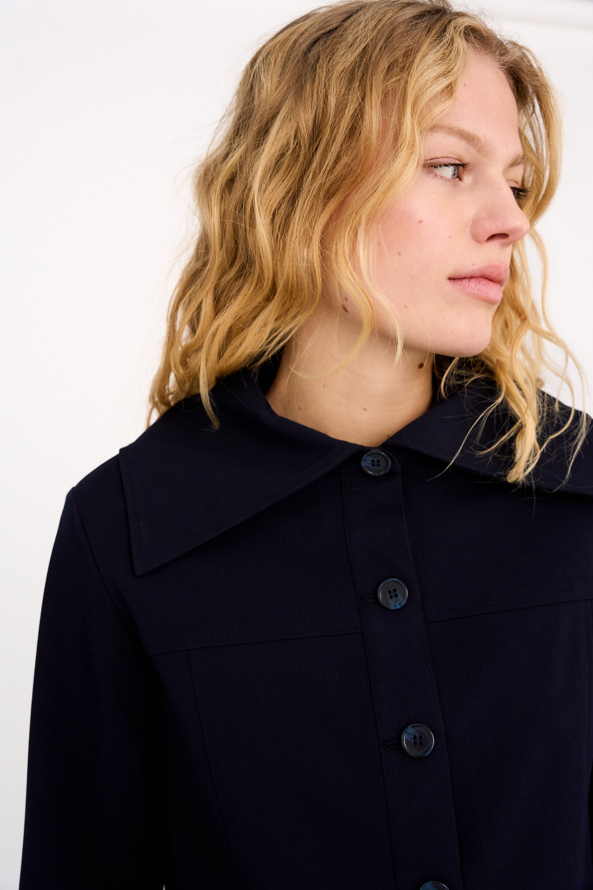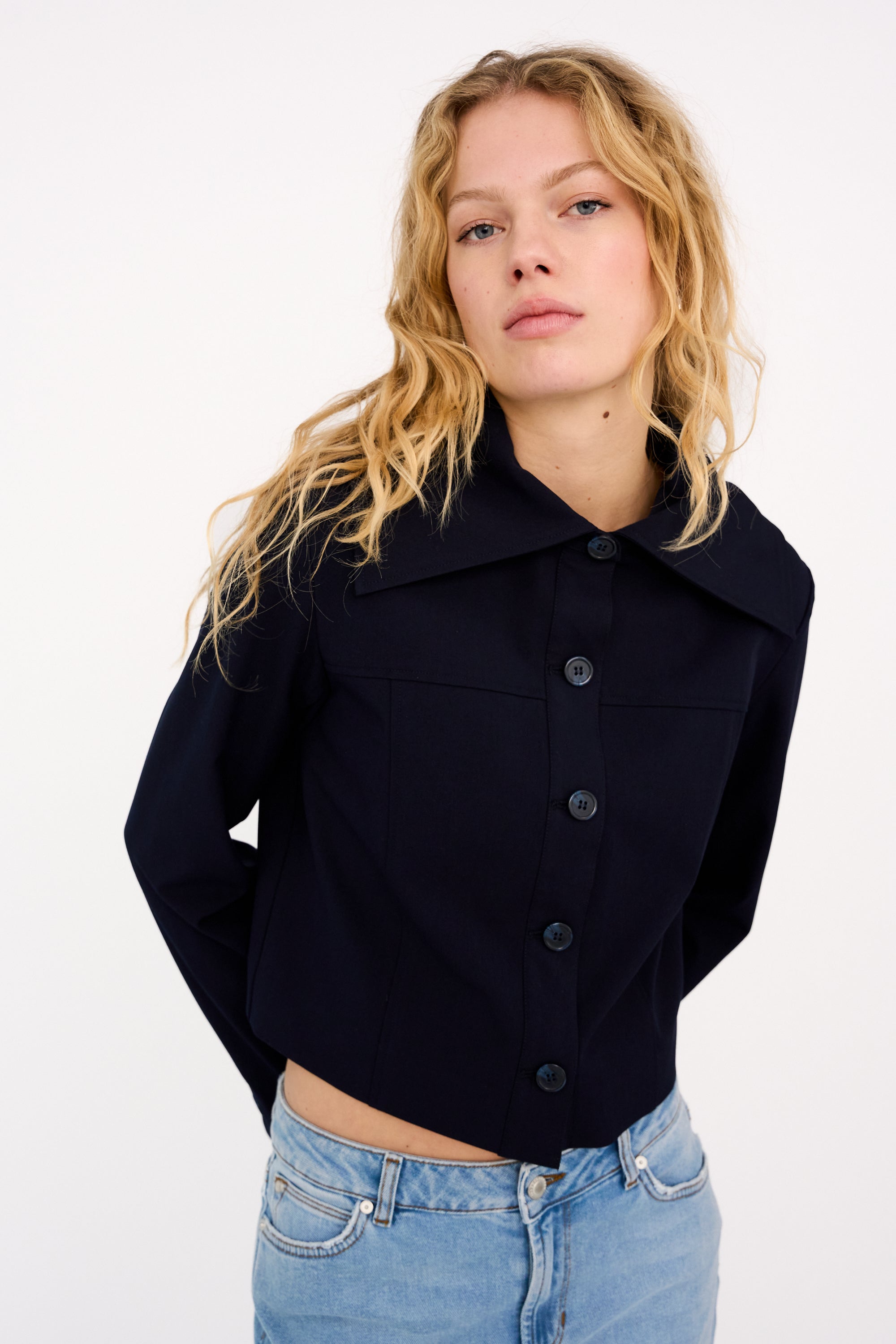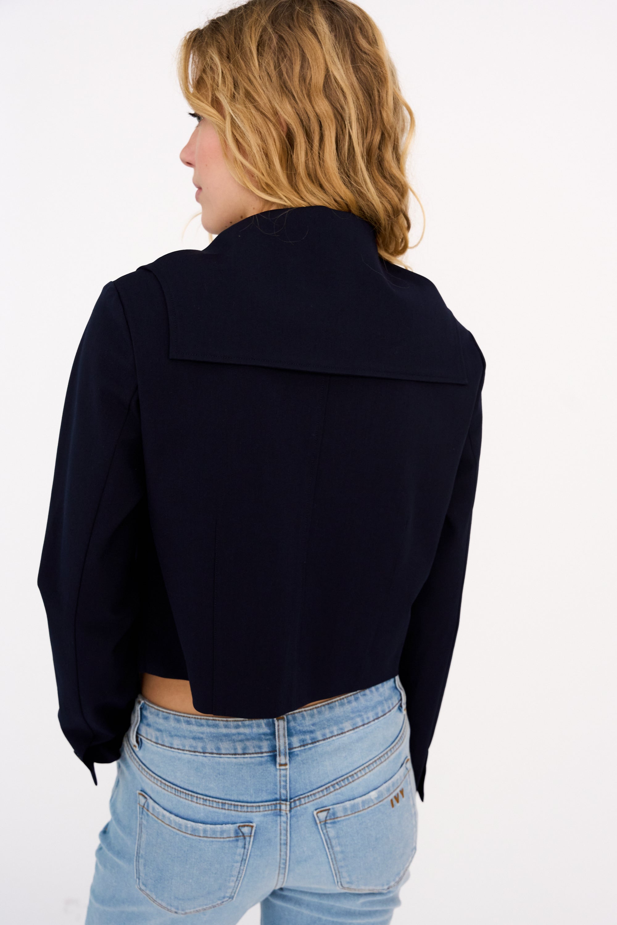 The Andrea Sailor Jacket is a clean-cut statement with subtle nautical nods. Crafted in a structured dark navy fabric, it features a sharp sailor collar and cropped silhouette for a modern, minimal finish.