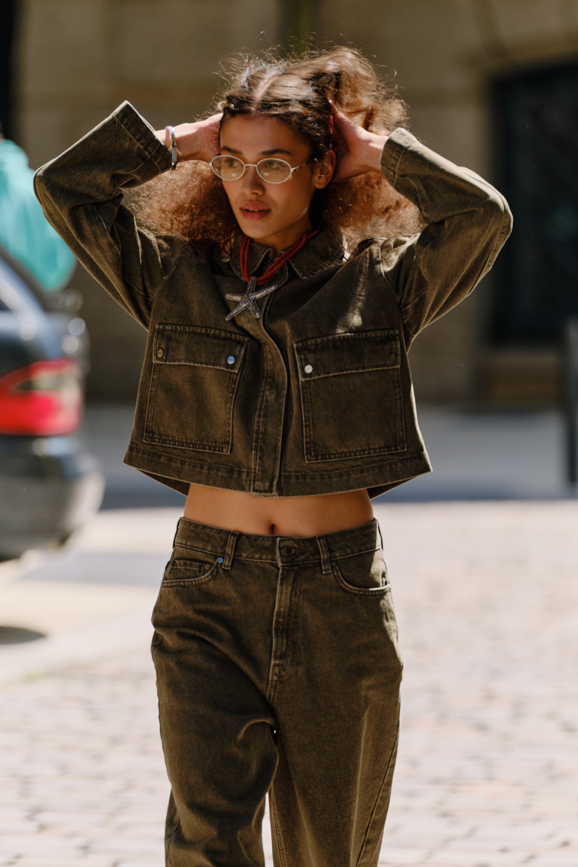 Pair it with high-rise denim or over soft tailoring – and let the muted green-grey wash do the talking.
