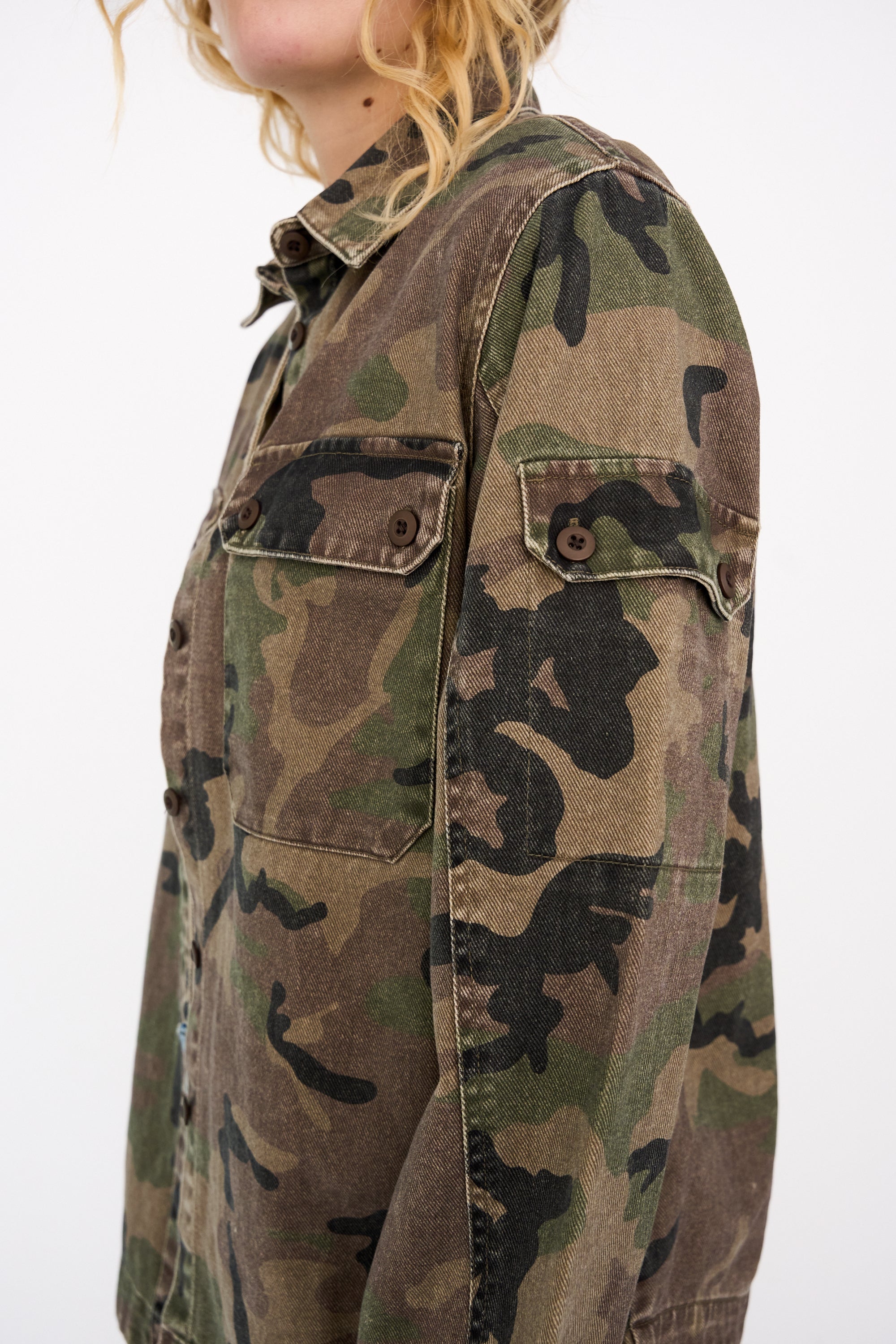 Karmey Festival Jacket is your outerwear fix when you're feeling bold. Designed in a classic army camo with a soft, worn-in feel, this overshirt-style jacket is perfect for layering.