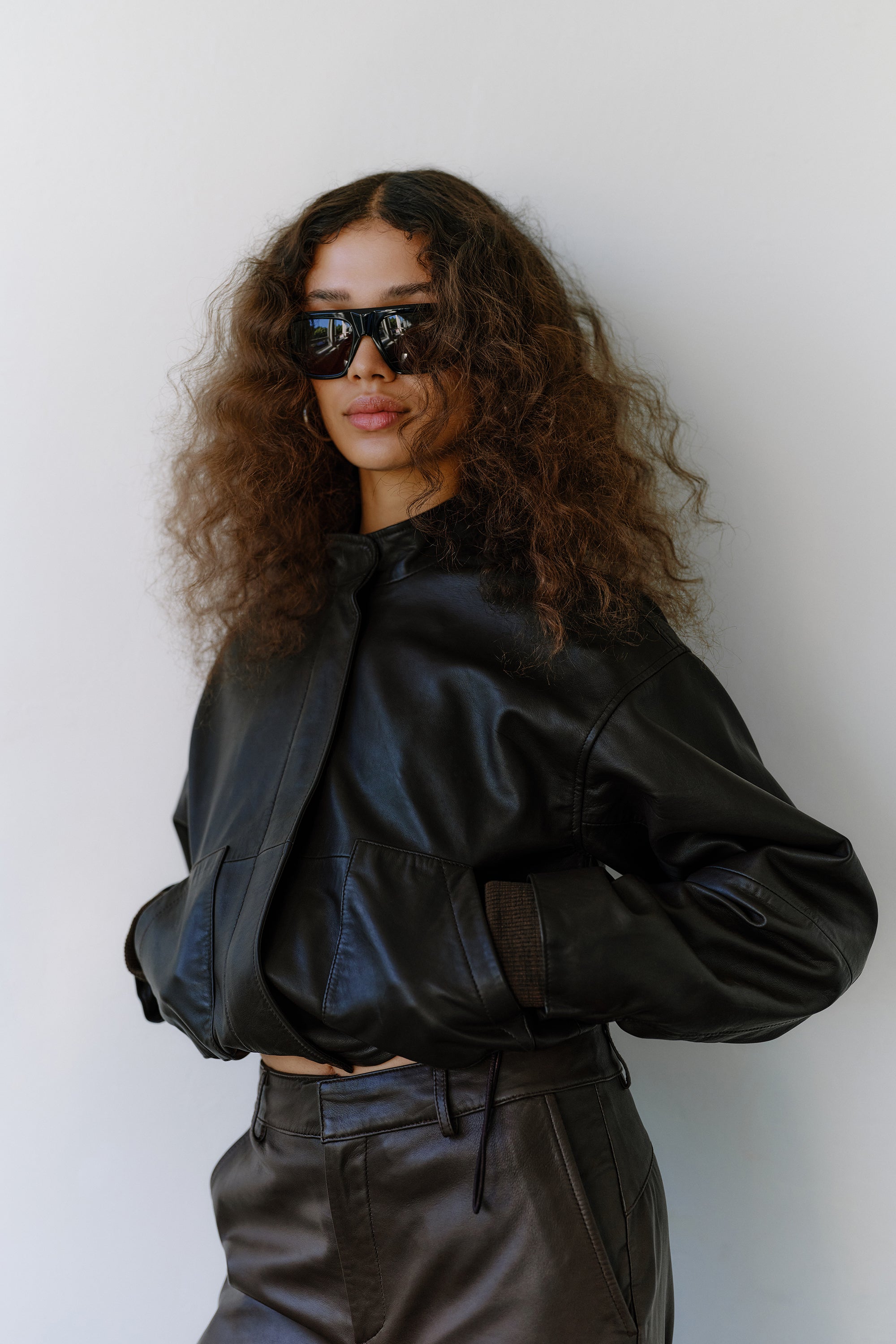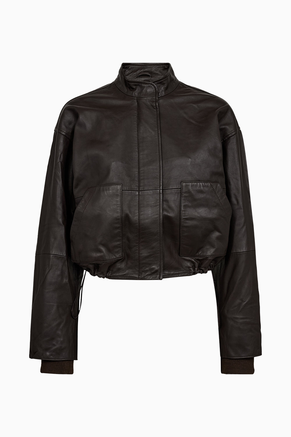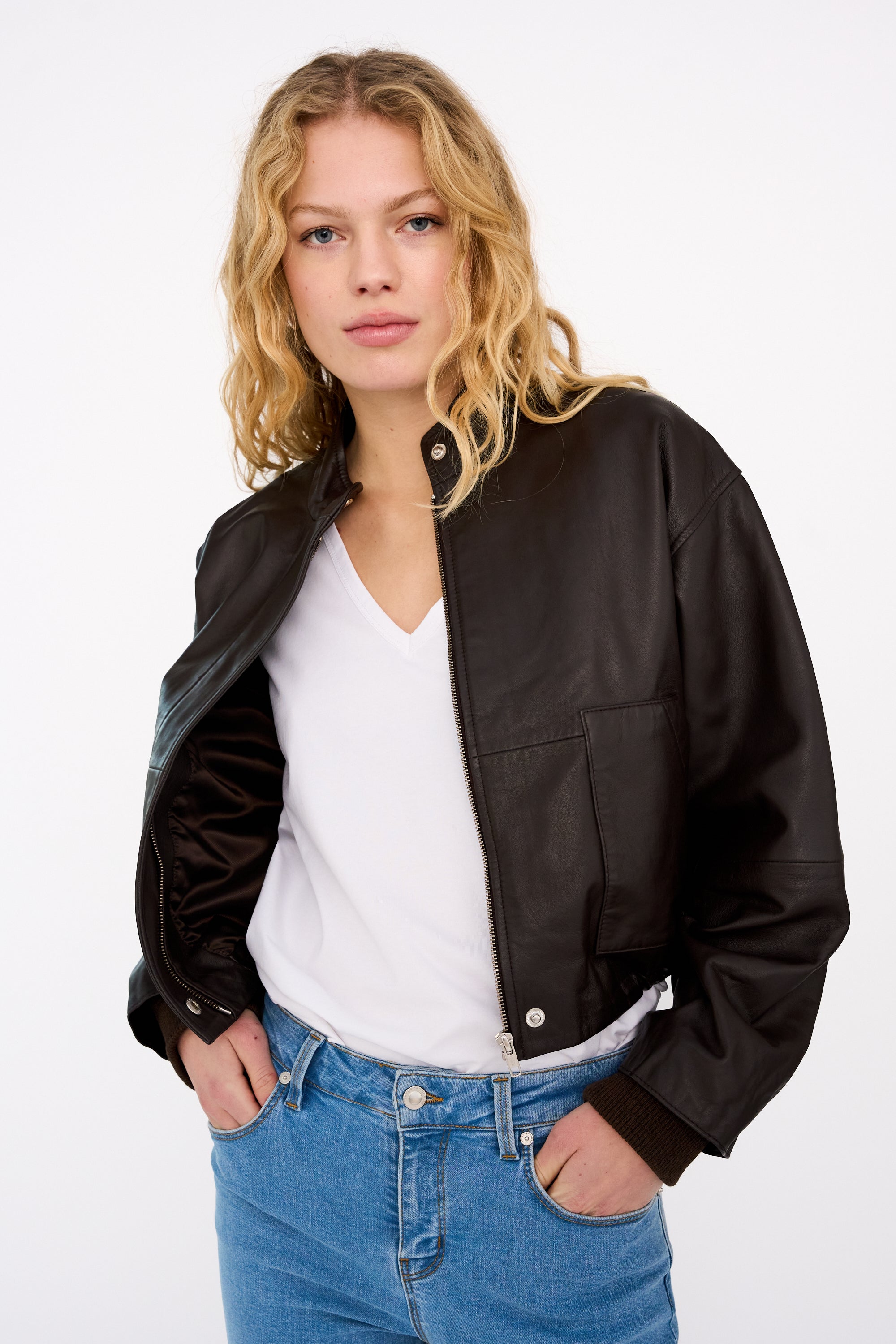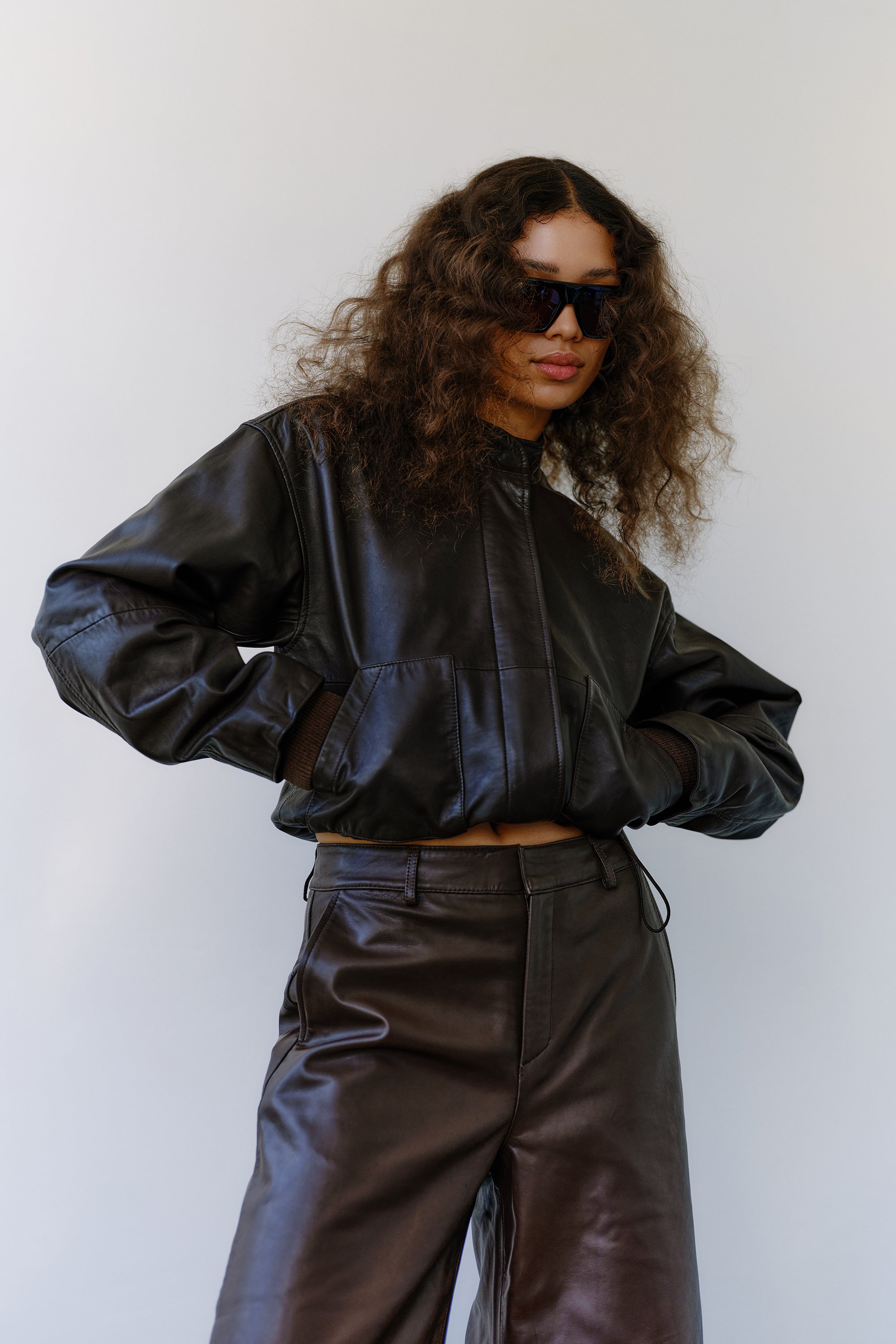 Kylie Adeleide Jacket is your shortcut to a cool-girl look with edge. Crafted from soft espresso-brown leather with a cropped silhouette, high neck and structured shoulders, this statement piece balances sharp minimalism with relaxed utility.