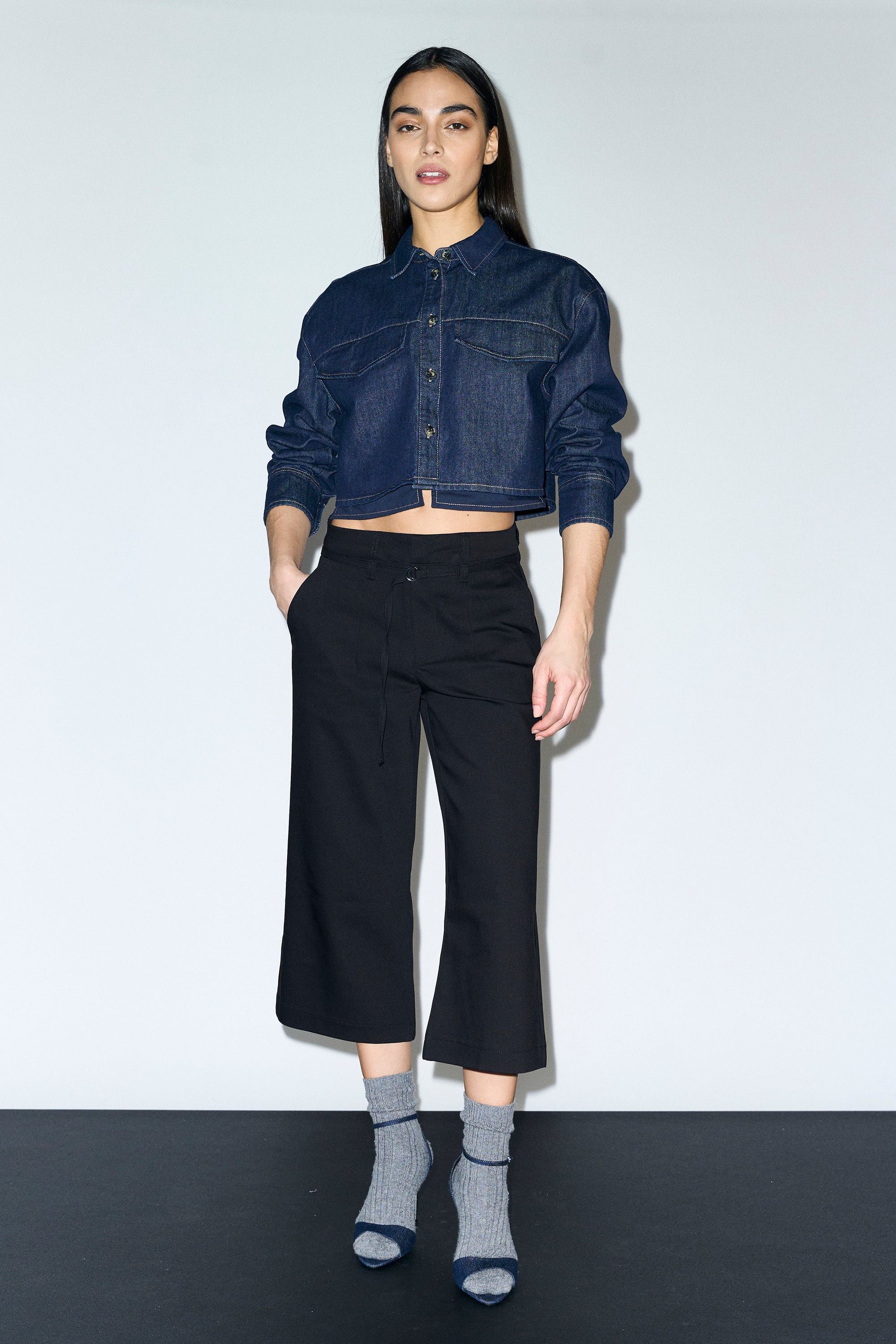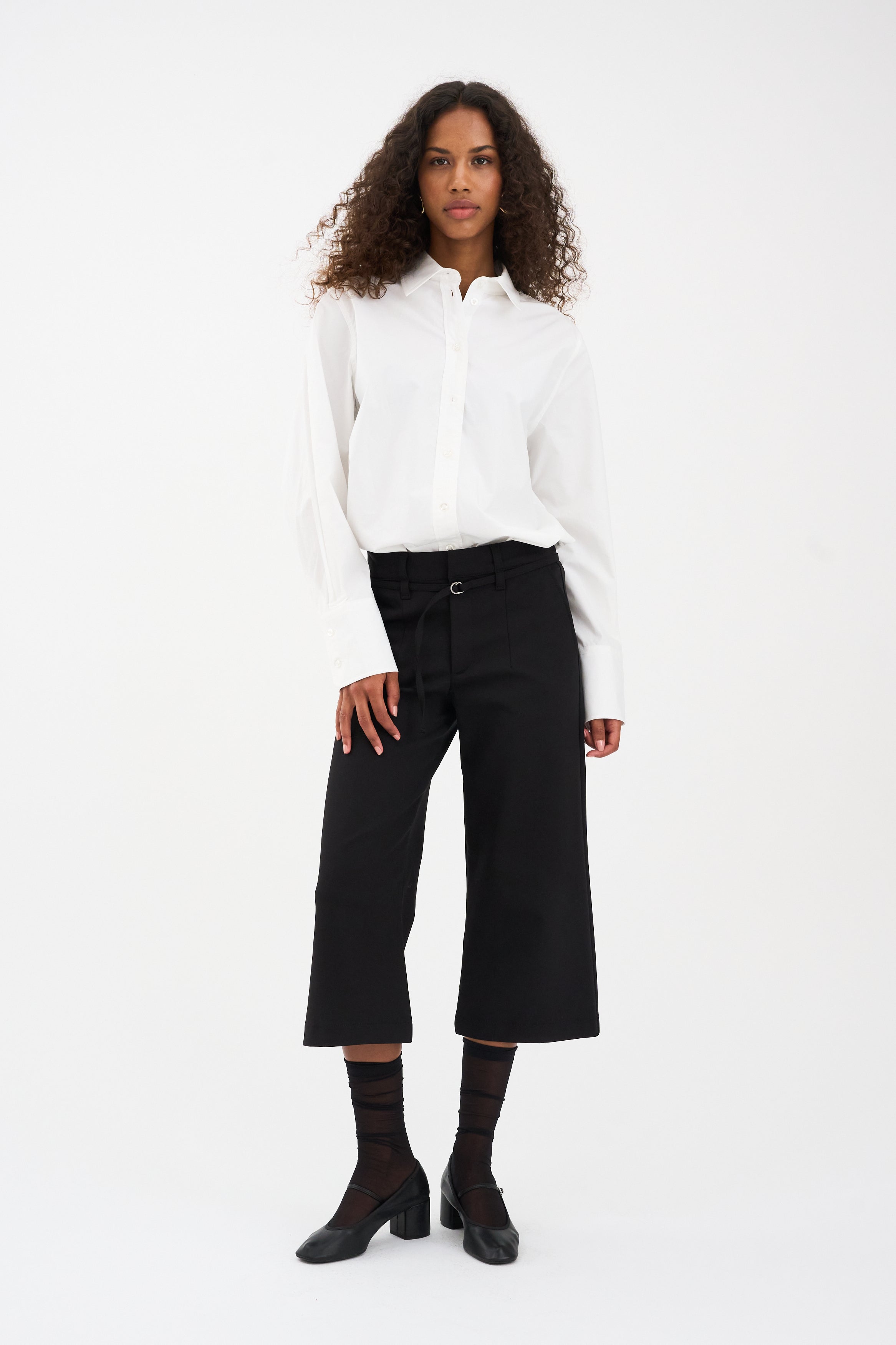 These culottes bring a sharp, tailored attitude with a relaxed, modern edge. Designed with a high-rise waist and a clean, wide leg, they create a flattering, structured silhouette that feels effortless yet refined. The belted waist detail adds a subtle statement, while the fluid construction keeps the look polished and easy to style
