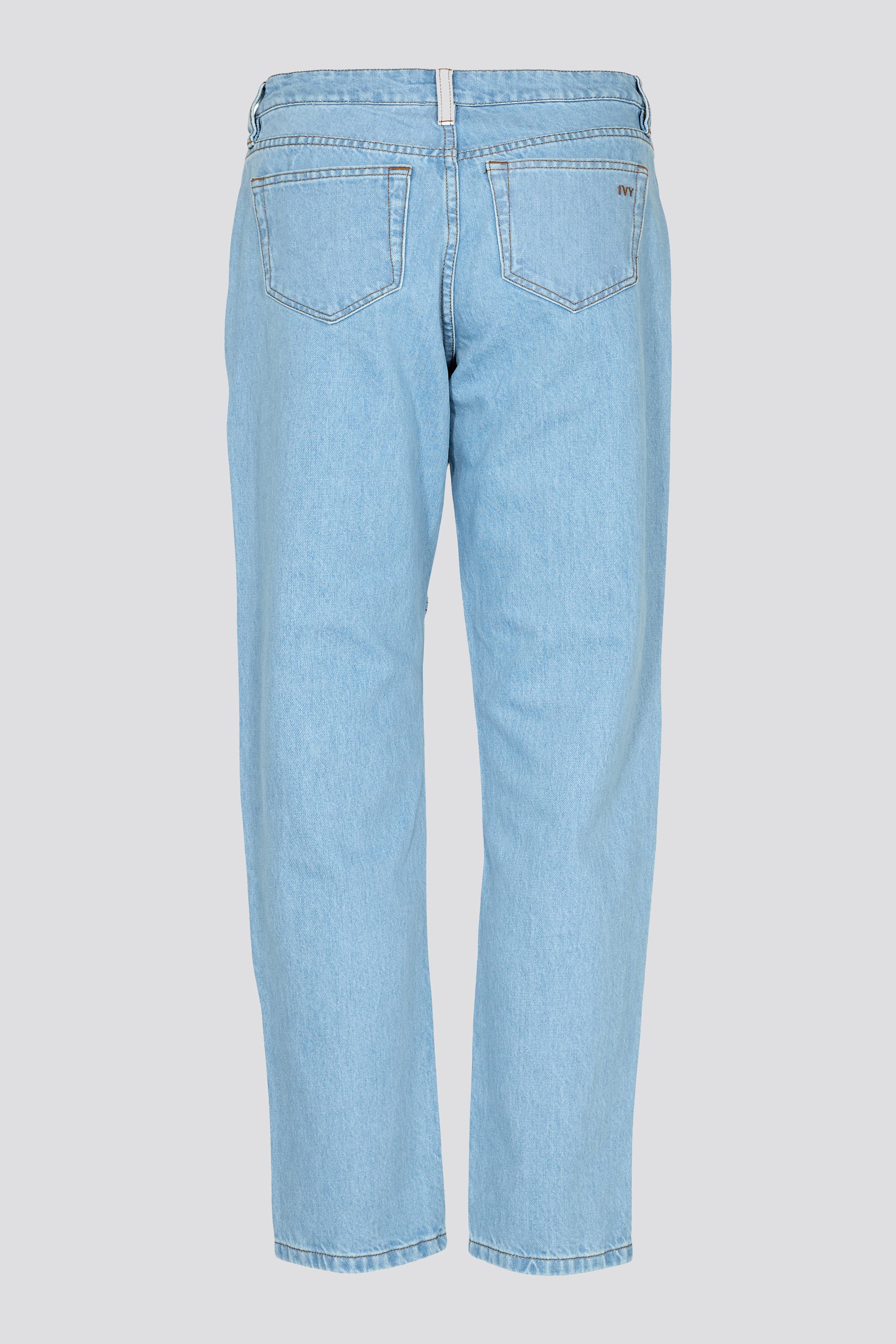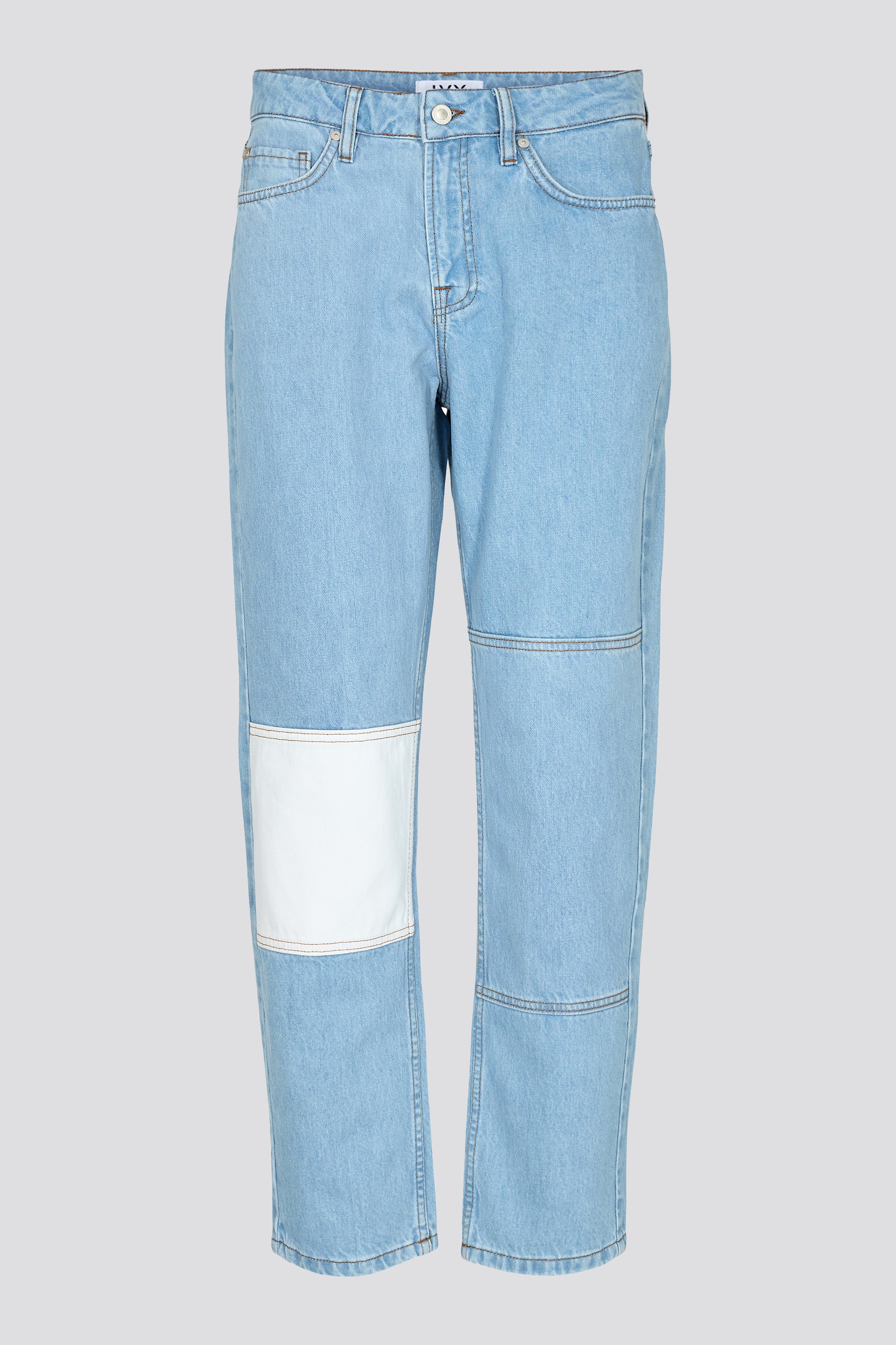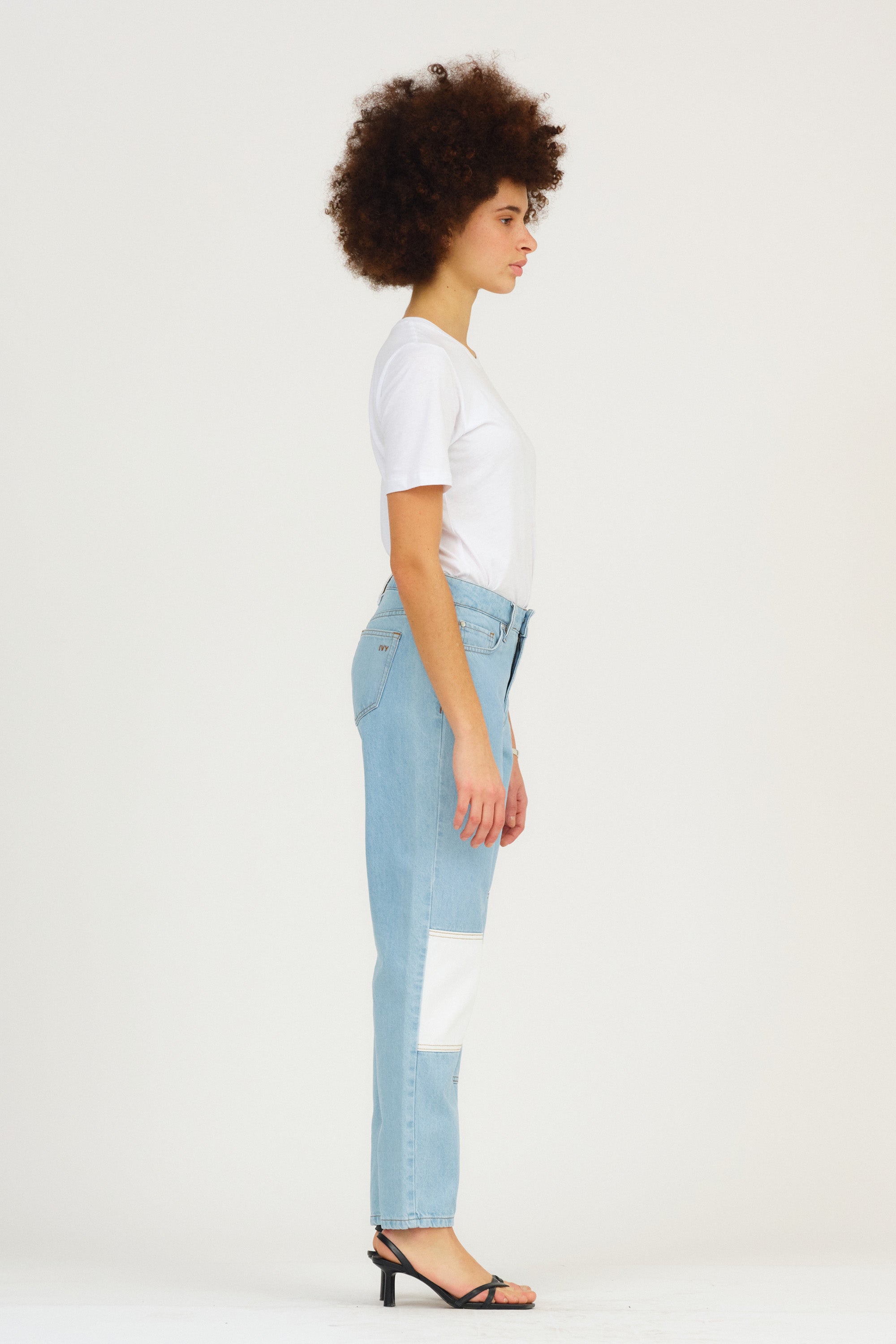 Our Tonya jeans colour block comes in a light blue wash with a regular fit, high waist, tapered leg and ankle length. It has a colour block detail at knee and contrast stitching.