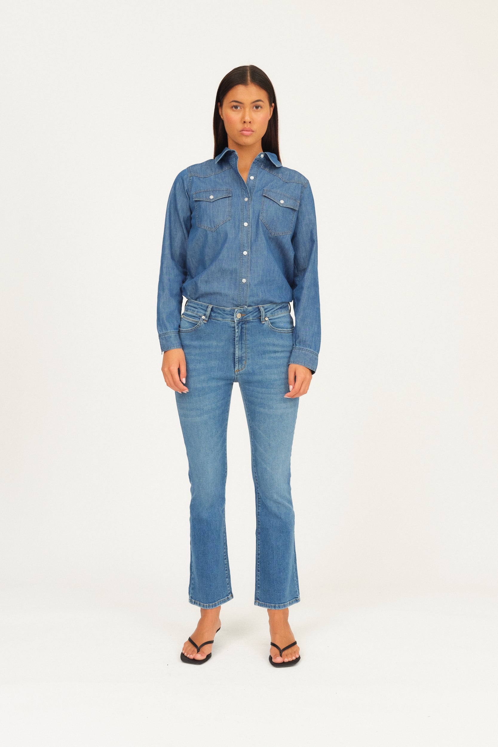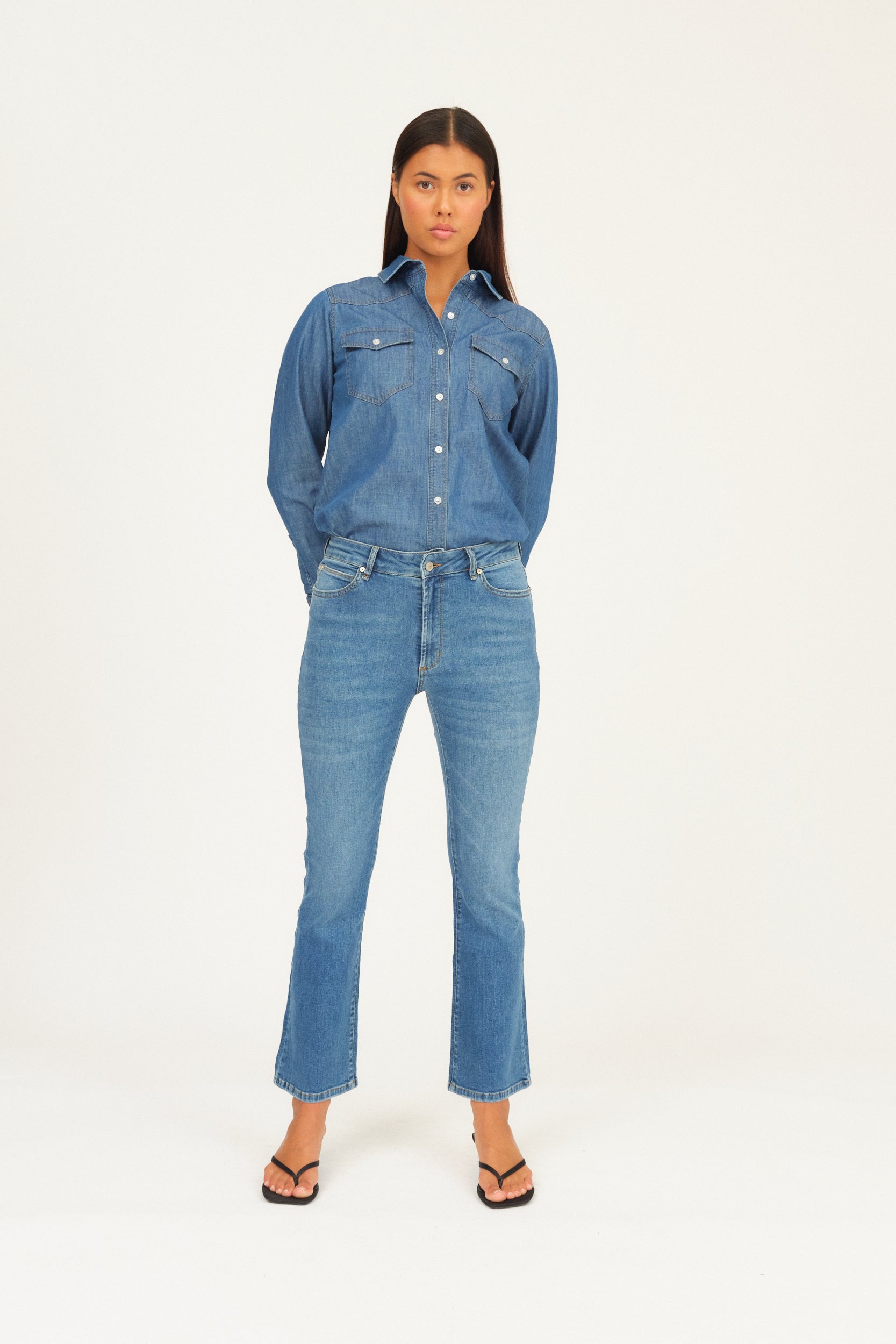 Our Johanna jeans in a washed denim blue. It has a skinny fit, mid waist and cropped flare leg.
