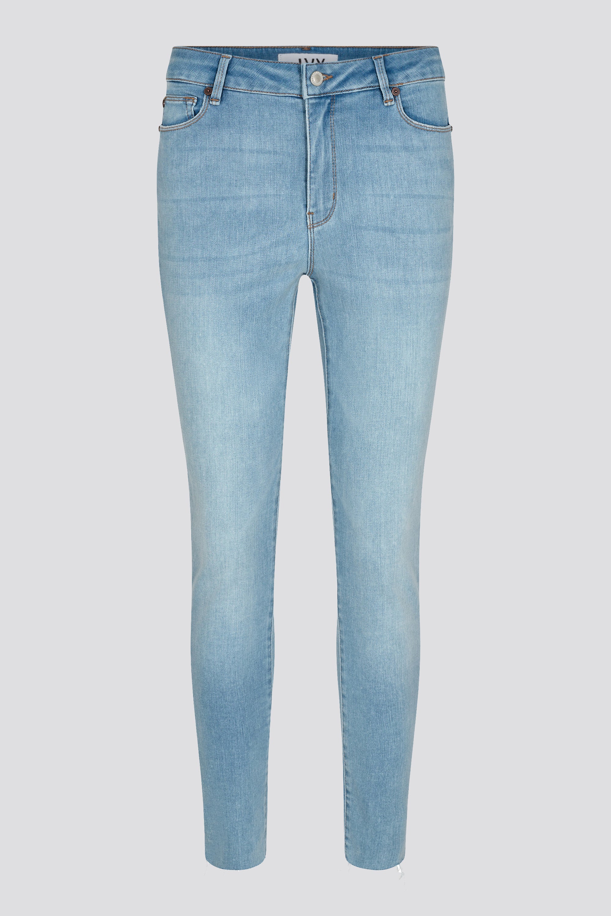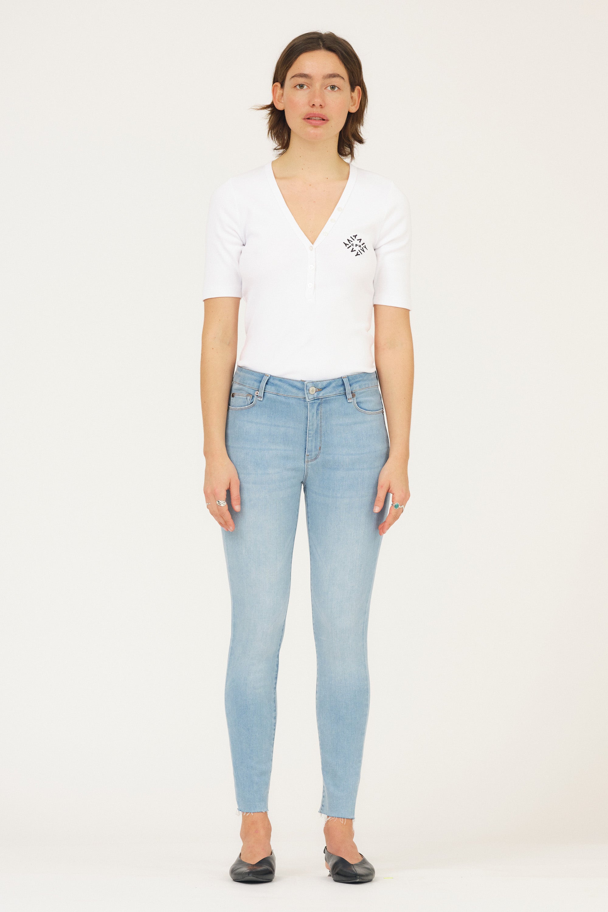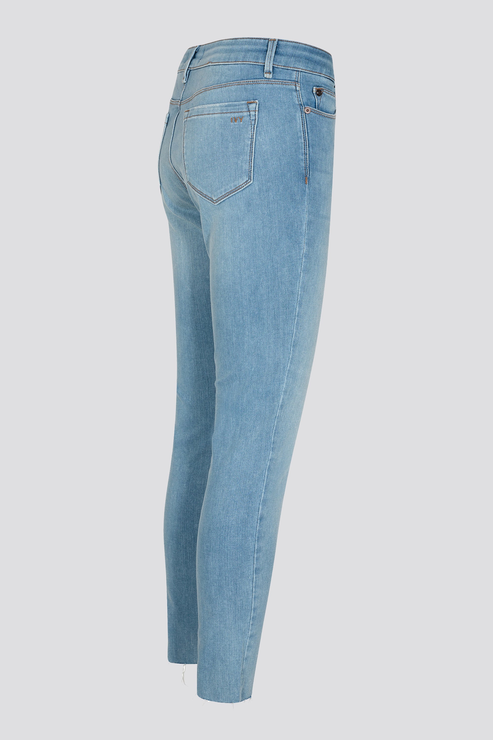 Alexa Jeans Wash Lecco comes in a skinny fit with high waist and ankle length. Made in a stretchy, cotton blend quality in a very light blue denim wash with worn effect. Comes with five pockets, zip and button closure, yellow stitching and undone hem.