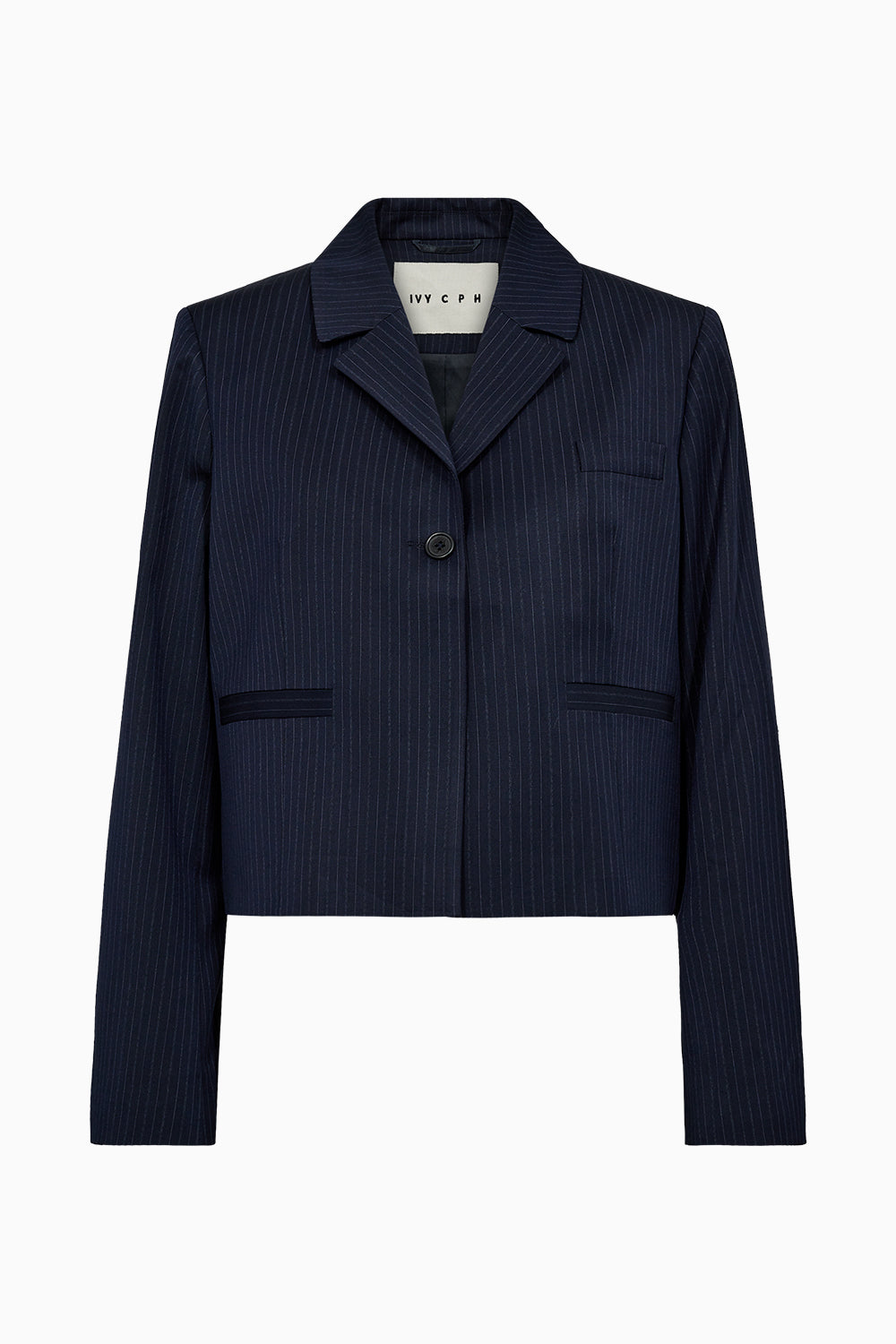 Paula is our take on the modern blazer – designed with clean lines, sharp lapels and a boxy, cropped silhouette. The navy pinstripes bring a refined, masculine edge, while the short length adds a fresh and feminine twist.